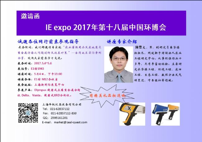 我公司將與奧林巴斯Olympus一同參加于2017年5月4~6日在上海舉辦的第十八屆中國環(huán)博會。屆時我們將邀請專家就“農(nóng)業(yè)灌溉用水及農(nóng)地遭受重金屬污染之問題剖析及改善對策”---臺灣地區(qū)實際案例分享。誠邀您前來交流指導!