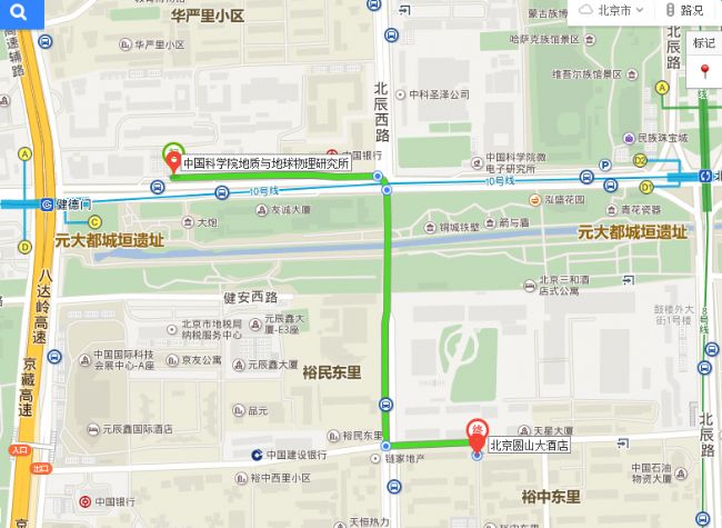 北京圓山大酒店至中國科學院地質與地球物理研究所地3樓步行路線: