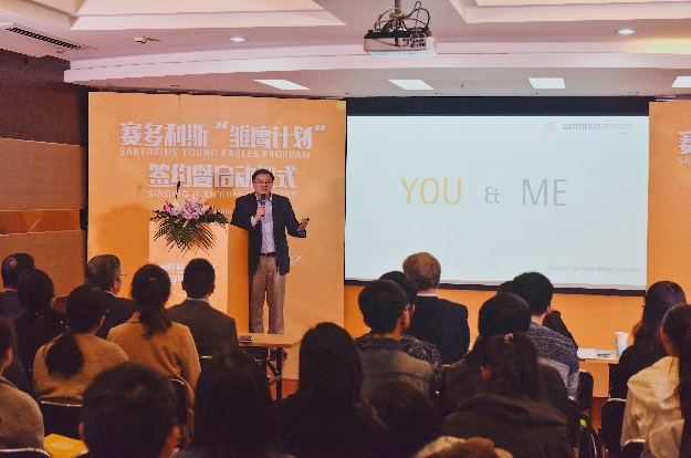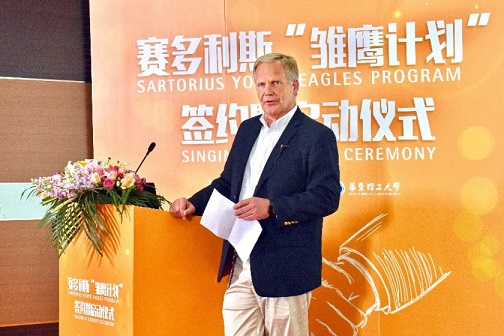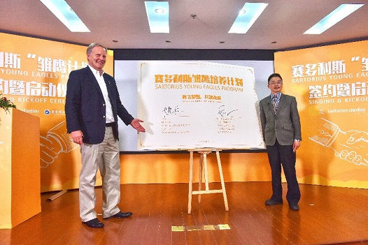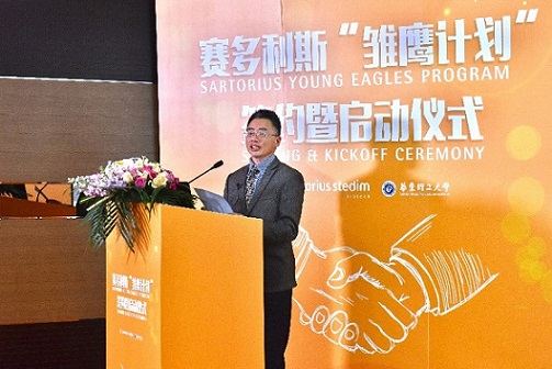 在儀式上,賽多利斯生物工藝部門亞太區(qū)高級(jí)副總裁Joerg Lindenblatt博士和華東理工大學(xué)生物工程學(xué)院黨委書記陸兵先生,分別代表校企雙方為雛鷹培養(yǎng)計(jì)劃簽約并致辭。
