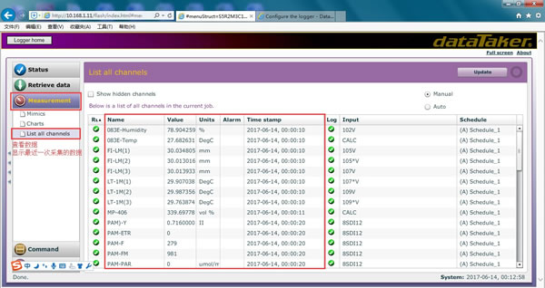 具有測量模擬量、數字量、高速計數器輸入量、相位編碼器輸入量和可編程串行數據量的傳感器通道,因此可簡單、直接的連接多種不同形式的傳感器和數據測量裝置。AgriPhenoCloud DT80可用于采集溫度、電壓、電流、4-20mA回路電流、電阻、電橋、應變儀、頻率、數字,或連接智能傳感器進行數據采集,同時可對采集到的不同原始數據進行計算,按所需要的工作單位或統計報告的形式將原始數據或計算結果返回到上位機。通過計劃設置實現分組采集、數據記錄、報警設置和控制作業以滿足不同的測量要求。智能傳感器、GPS、PLC和其他智能裝置可通過DT80的兩個串行傳感器接口(RS232或RS422、485)進行連接。客戶可選用 dataTaker的CANgate與DT80連接,實現CAN總線監測及數據采集。