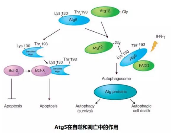 細(xì)胞自噬(autophagy)是進(jìn)化中一個(gè)高度保守的過(guò)程,通過(guò)溶酶體將胞質(zhì)蛋白和細(xì)胞器等進(jìn)行降解再利用。Atg5 是自噬體(autophagosomes)形成中一個(gè)關(guān)鍵的蛋白,在免疫系統(tǒng)中也起著重要的作用,有研究表明B淋巴細(xì)胞[ref 1]和T淋巴細(xì)胞[ref 2]的存活及增殖依賴于 Atg5。