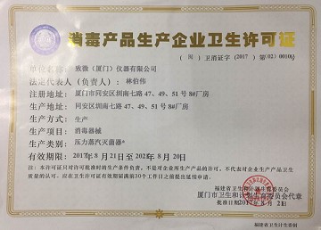近日,我司經過層層申請和把關,于2017年8月2日,順利通過福建省衛生和計劃生育委員會的審核,取得《消毒產品生產企業衛生許可證》,(閩)衛消證字 (2017)第(02)001號。我司現已成為行業內證件最齊全、全球領先的高壓滅菌器專業制造商。