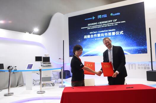 同時在發布會現場,華大智造副總裁蔣慧和德國康瑞提斯有限公司(Curetis)首席市場官兼阿瑞斯遺傳學有限公司(Ares Genetics)常務董事Dr. Achim Plum分別代表華大智造與德國康瑞提斯有限公司(Curetis)、阿瑞斯遺傳學有限公司(Ares Genetics)完成戰略性合作意向書的簽署。