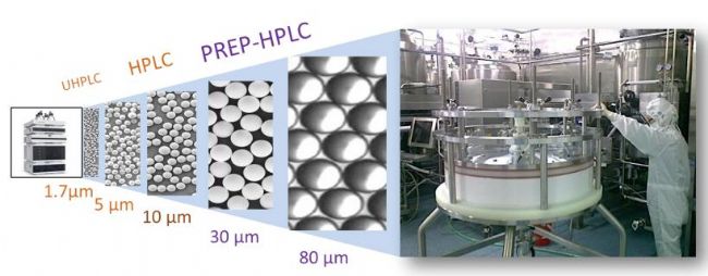第二代硅膠色譜填料產品是80年代國外開發出來球型硅膠色譜填料。這種填料形態一致性好,尤其是小粒徑球形硅膠(<10微米)的出現,極大地改善了硅膠色譜填料的分離性能,使得制備色譜成為工業分離純化最重要的方法。因此球型硅膠被廣泛地用于生物藥(如胰島素,多肽)、手性藥物、抗生素、中藥等大規模分離純化。但由于其制備技術壁壘高,篩分設備昂貴,工藝技術復雜,長期以來,中國國內企業一直無法生產出合格的球型硅膠色譜填料。