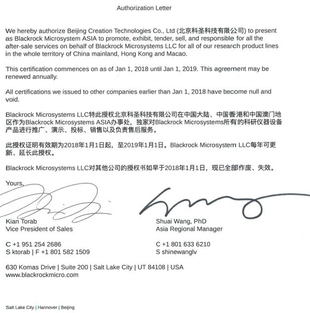 從2018年1月1日起,Blackrock Microsystems授權北京科圣科技有限公司在中國大陸、香港及澳門地區作為Blackrock Microsystems ASIA辦事處,唯一合法的對Blackrock Microsystems所有的科研儀器設備產品進行推廣、演示、投標、銷售,以及負責售后服務。Blackrock Microsystems給與其他公司的授權書全部作廢、失效!