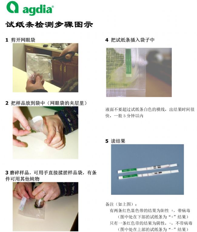傳統(tǒng)的田檢操作都是去試驗(yàn)田 疑似的病株采集、記錄、保存、帶回實(shí)驗(yàn)室檢測(cè)等,而快檢試紙條可以直接現(xiàn)場(chǎng)操作,五分鐘出結(jié)果,簡(jiǎn)單方便,不需要專業(yè)技術(shù)人員,最大限度的節(jié)省工作量。同樣適合于沒(méi)有實(shí)驗(yàn)室的企業(yè)使用。具體操作如下:
