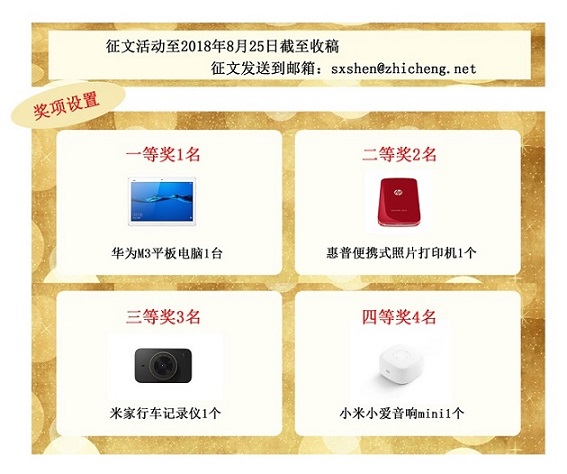 請將您聯系方式及征文發送到sxshen@zhicheng.net,入選后工作人員會直接聯系您發放禮品。