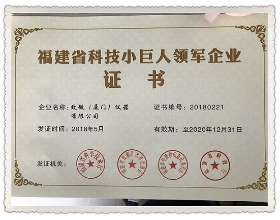根據(jù)福建省科技廳、省發(fā)改委、省經(jīng)信委、省財(cái)政廳聯(lián)合發(fā)布的《關(guān)于公布2018年省科技小巨人領(lǐng)軍企業(yè)新增培育名單等情況的通知》,致微(廈門)儀器有限公司憑借雄厚的資質(zhì)、20項(xiàng)專利、自主研發(fā)實(shí)力被列入省科技小巨人領(lǐng)軍企業(yè)培育發(fā)展庫(kù),并榮獲“省科技小巨人領(lǐng)軍企業(yè)”稱號(hào)。
