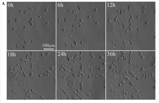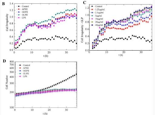 圖1 利用高內涵成像系統的活細胞追蹤功能,對多糖處理的細胞形態變化和細胞計數的實時跟蹤并分析量化。(A) GLPII 在 0 小時,6 小時,12 小時,18 小時,24 小時,36 小時誘導的細胞分化。(B) 用 APSII,GLPII 和 OGPII 處理細 胞,并隨時間繪制細胞的形態不規則程度。不規則值與細胞分化狀態正相關。(C) GLPII 引起的濃度依賴性細胞不 規則性改變。(D) APSII,GLPII 和 OGPII (40 μg/ml) 對細胞增殖的影響。將 0.1μg/ml 的 LPS設定為陽性對照。值 表示為平均值 ±SEM。