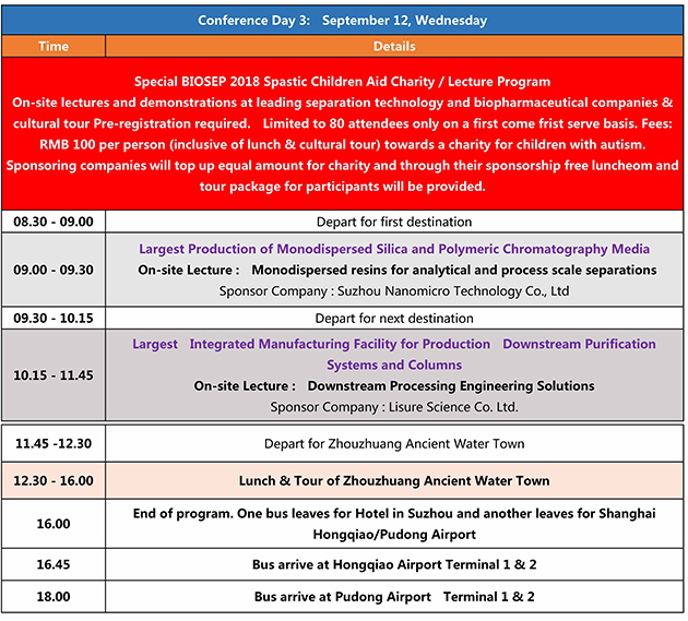 第五屆制藥分離純化技術學術論壇和1st BIOSEP International Conference 2018將牽手蘇州工業園區慈善基金會、太陽花兒童服務中心舉辦慈善捐款活動,為自閉癥兒童及其家庭獻出愛心。本次捐款由參會人員自愿選擇參加與否,論壇慈善主辦方將額外捐出現場捐款總額等金額款項,最后將所有捐款實名捐給慈善機構。前80名捐款的參會者,還可以參加9月12日工廠參觀和古鎮游覽活動。