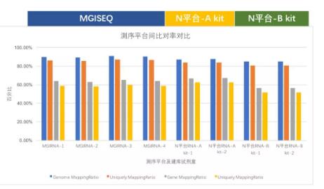 MGISEQ-2000平臺上的Genome mapping ratio比N測序平臺高約2%,Gene mapping ratio比N測序平臺上的B建庫試劑盒的高約6%。