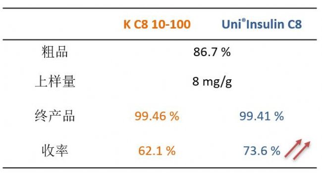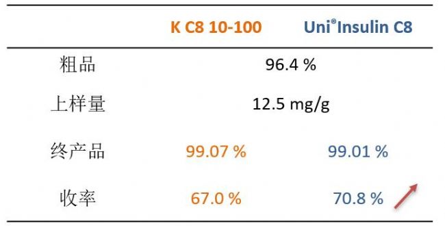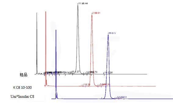 由上圖可以看出,在12.5mg/g(7.5g/L)的載量下,采用K 公司C8 填料最終的收集純度為99.01%,主要雜質(zhì)為3個(gè),其收率為67.0%。同樣采用Uni®Insulin C8填料其收集純度為99.07%,主要雜質(zhì)為2個(gè),其收率為70.8%。綜合比較,采用Uni®Insulin C8填料稍優(yōu)。