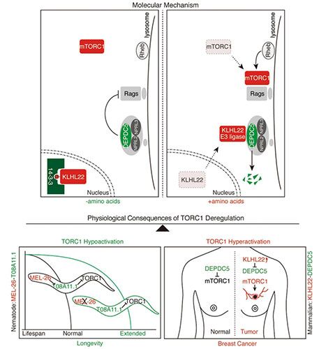 腫瘤和衰老是威脅人類健康的主要代謝疾病。我們發現關鍵分子KLHL22通過激活mTORC1同時促進腫瘤和衰老的發生。設計藥物靶向KLHL22有望成為抗腫瘤和促長壽的新策略。