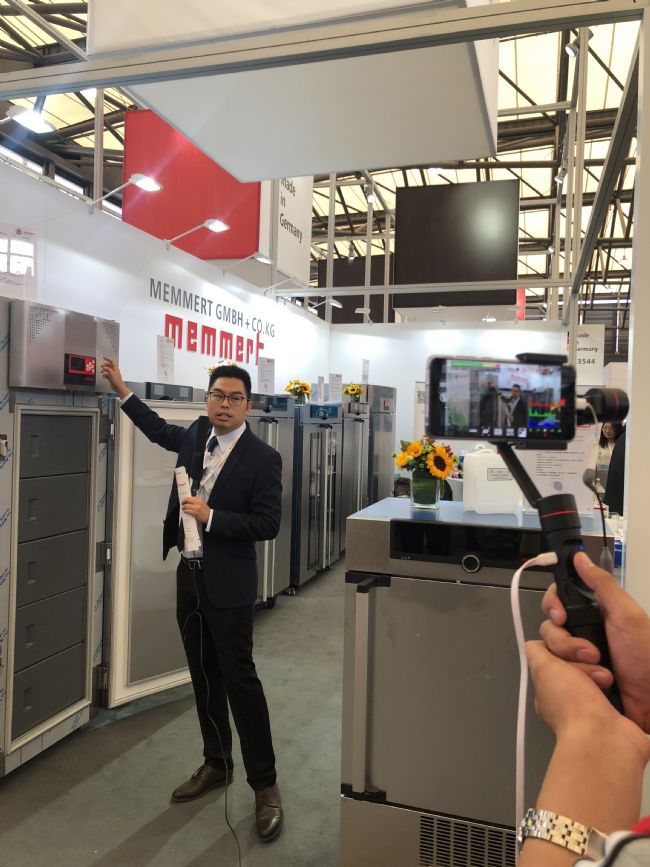 展會期間,前來展臺參觀交流的觀眾自始至終絡繹不絕,有多年合作的老友,也有慕名而來或者偶遇駐足的國外新朋。Memmert準備充足,有十數位產品專家現場提供咨詢服務,為觀眾關心的問題進行講解釋疑,蒞臨觀眾無不對“Made in Germany”的品質與現場服務贊賞有加。其中不乏帶有誠意前來考察箱體的用戶朋友,考察后操作體驗滿意度普遍較高。Memmert精心準備的小禮品產品樣冊也頗受歡迎,觀眾紛紛前來申領。期間合作媒體還對Memmert售后服務經理作了專訪。