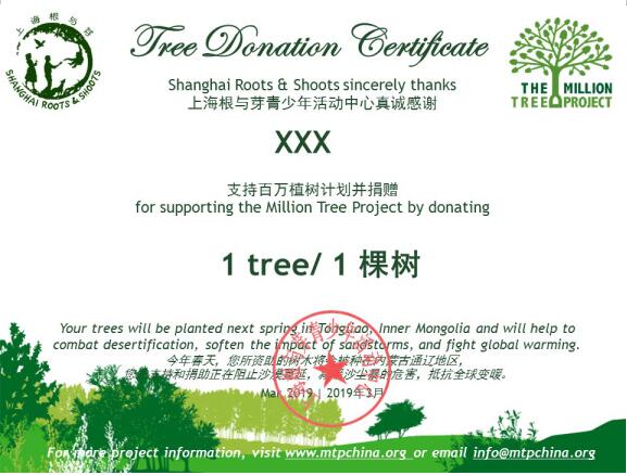 我們將會(huì)以您的名義捐贈(zèng)樹(shù)苗一棵,并由“上海根與芽”給您頒發(fā)捐贈(zèng)證書(shū)。