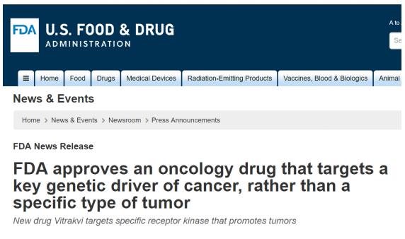2018年11月26日,Loxo Oncology公司和 Bayer公司共同研發的拉羅替尼(又名Loxo-1/藥品名Larotrectinib/ 商品名Vitrakvi),作為首款針對組織不確定應用而研發的抗腫瘤口服小分子藥物的獲批上市,標志著精準治療領域的又一里程碑式突破,也加速了腫瘤治療的策略調整[1]。