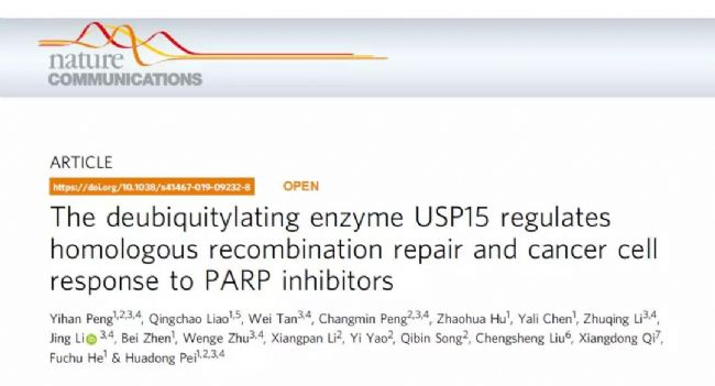2019年3月15日,國(guó)家蛋白質(zhì)科學(xué)中心(北京)研究員、課題組長(zhǎng)裴華東博士及其研究團(tuán)隊(duì)在國(guó)際多學(xué)科綜合性期刊、Nature子刊《Nature Communications》(自然-通訊,IF=12.353)上發(fā)表了研究成果The deubiquitylating enzyme USP15 regulates homologous recombination repair and cancer cell response to PARP inhibitors(DOI "10.1038/s41467-019-09232-8”)。