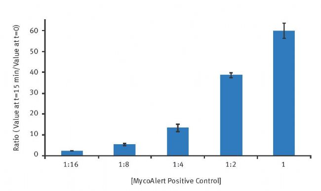 CLARIOstar酶標儀具有超高的檢測靈敏度,即使MycoAlert陽性對照被稀釋16倍,依然很輕易的檢測出支原體的存在。