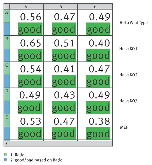 判斷樣本是否有支原體污染通過計算MycoAlert的比率來判斷。CLARIOstar酶標儀自帶的分析軟件MARS,自動計算MycoAlert的比率,并且自動顯示每個樣本是好是壞,樣本是否有支原體污染一目了然。