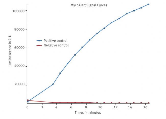 MycoAlert分析采用化學發光技術,指示支原體的存在。下圖是加入底物之后,使用CLARIOstar酶標儀檢測發光強度,支原體陽性對照相對于陰性對照而言,發光強度明顯增加。