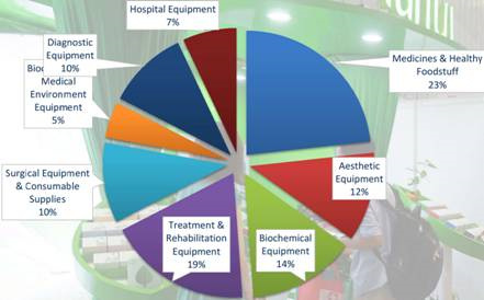 醫療產品:醫療設備及儀器、醫用消耗品、醫用敷料、手術設備、救護設備、診斷設備及用品、眼科儀器及設備、耳鼻喉科設備、牙科設備及用品、醫用試劑及設備,醫療保健品及器材、醫療機構及實驗室技術設備、醫學信息及技術交流、美容儀器