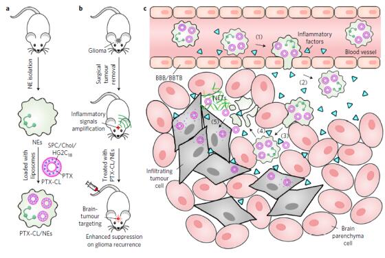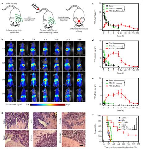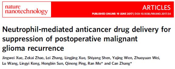 2017年中國藥科大學張燦教授課題組在Nature Nanotechnology雜志(影響因子38.986)上發表論文,借助脂質體納米載體,使用中性粒細胞治療與化療藥物紫杉醇(Paclitaxel, PTX)聯合治療腦膠質瘤,實現了高效自主引導的藥物靶向遞送,對原位腦膠質瘤小鼠模型術后的復發起到顯著抑制效果。