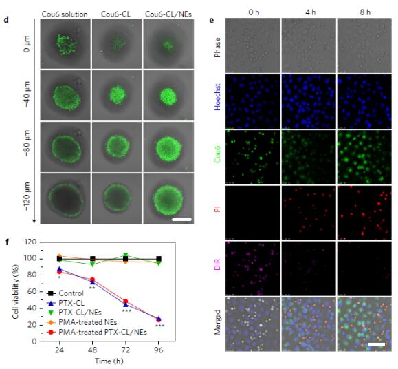 在3D膠質瘤細胞模型上,使用Cou6探針(綠色)標記脂質體納米顆粒,通過共聚焦光學切片觀察不同處理條件下的脂質體對3D細胞的浸潤情況, Cou6-CL/NEs復合體組能更好的侵入3D腫瘤細胞微球內部(上圖d)。在單層G422神經膠質瘤細胞模型上,通過Cou6探針(綠色)標記脂質體/DiR(紫色)標記中性粒細胞/Hoechst(藍色)標記所有細胞核/PI(紅色)標記死細胞,通過顯微成像觀察不同處理時間點,中性粒細胞釋放NETs及對G422膠質瘤細胞的殺傷情況,隨著時間的推移,8小時后中性粒細胞釋放Cou6,且被G422細胞內吞后造成細胞死亡(上圖e)。通過G422細胞存活實驗進一步驗證,PMA處理的細胞制劑(PTX-CL/NEs)與PTX-CL具有相當的腫瘤殺傷效果(上圖f)。