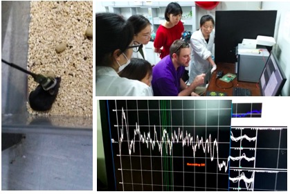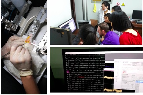 此次拜訪中的新鄉(xiāng)醫(yī)學(xué)院是國內(nèi)電生理領(lǐng)域的后起之秀,他們有著精湛的膜片鉗技術(shù),同樣也緊握時代的前沿,大力發(fā)展在體多通道電生理技術(shù)。在體多通道電生理技術(shù)對于同學(xué)們是一個全新的領(lǐng)域,但在東樂自然基因公司的技術(shù)人員的指導(dǎo)下,同學(xué)們親自操刀,對實(shí)驗(yàn)動物進(jìn)行了固定、備皮和開顱并順利的把多通道電極(MWA)下降到大鼠海馬(Hippocampus)腦區(qū),并記錄到了3個通道的峰電位放電(Spikes)和16個通道的場電位(LFP)。Neuralynx產(chǎn)品工程師Tate對同學(xué)們進(jìn)行了專業(yè)的培訓(xùn),大家對實(shí)驗(yàn)技術(shù)更加有信心,對儀器的使用更加熟練。在實(shí)驗(yàn)中,Nueralynx展現(xiàn)出了極低的噪音和極高的穩(wěn)定性,界面簡單易懂,功能強(qiáng)大,得到了老師和同學(xué)的喜愛。相信在未來的日子里,新鄉(xiāng)醫(yī)學(xué)院的老師和同學(xué)們會好好利用Neuralynx在體多通道記錄系統(tǒng),在神經(jīng)科學(xué)領(lǐng)域取得更好的成就。
