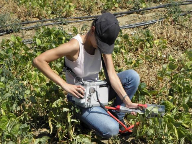 B. 一位博士研究生操作LCPro+光合儀測量干豆(菜豆)在不同灌溉水平下的氣體交換參數(shù)。