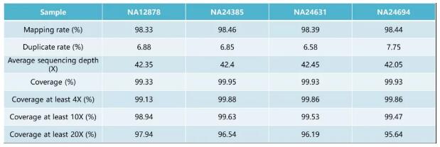 以全基因組測(cè)序?yàn)槔,DNBSEQ-T7的首批測(cè)序數(shù)據(jù)表現(xiàn)不俗,這批測(cè)序數(shù)據(jù)采用人細(xì)胞系標(biāo)準(zhǔn)樣本,利用MGIEasy PCR-free DNA文庫(kù)制備試劑盒完成建庫(kù),通過(guò)DNBSEQ-T7RS高通量測(cè)序試劑套裝 (PE100)進(jìn)行測(cè)序,并采用華大智造自研的生物信息分析硬件加速系統(tǒng)MegaBOLT進(jìn)行全基因組數(shù)據(jù)分析。
