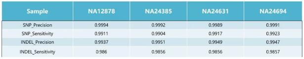 全基因組測(cè)序的SNP和Indel檢測(cè)結(jié)果顯示,20X覆蓋度在95%以上,變異檢測(cè)的SNP精確度和敏感度均在99%以上,Indel的精確度和敏感度均在98%以上。