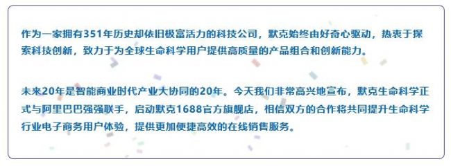 默克1688官方旗艦店的上線是默克生命科學業務在中國市場發展的又一里程碑。用戶體驗一直是默克的重中之重,我們將持續不斷地探索創新和有效的方式來滿足多樣化的需求,提升用戶體驗。