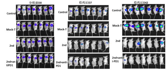 目前,CAR-T療法在血液腫瘤中治療效果明顯,而在實體腫瘤治療中面臨更加嚴峻的挑戰。究其原因,主要與實體腫瘤高度異質性和復雜的腫瘤免疫抑制微環境密切相關。因此如何突破實體瘤的治療障礙是 CAR-T研究的聚焦點之一,也是所有腫瘤患者熱烈期盼所在。近期,協同創新中心完成了多項新型CAR-T細胞制劑治療實體瘤的臨床前評價工作,取得了令人鼓舞的結果。其中,一項新型CAR-T制劑在治療人腎癌細胞786O-CD19-GFP-Luc皮下移植瘤模型中,效果尤為顯著。在CAR-T細胞單次靜脈注射治療后7和42天時,進行小動物活體成像。結果顯示治療7天后,治療組多只小鼠腫瘤消失,且42天時仍未見復發(圖1和圖2)。此結果提示該新型CAR-T細胞在治療實體瘤領域具有良好的前景。