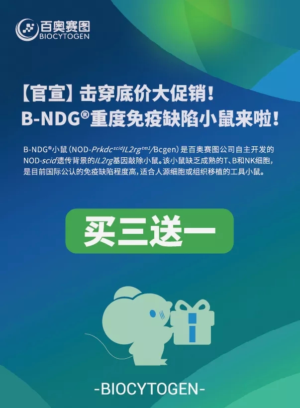 B-NDG®小鼠(NOD-Prkdcscid IL2rgtm1/Bcgen)是百奧賽圖公司自主開發的,NOD-scid 遺傳背景的IL2rg基因敲除小鼠,缺乏成熟的T、B和NK細胞,是目前國際公認的免疫缺陷程度高、適合人源細胞或組織移植的工具小鼠。