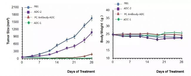 結果顯示:與PBS對照組相比,兩種受試ADC藥物和陽性對照組不同程度抑制了PDX模型鼠體內的腫瘤生長,基于B-NDG小鼠構建的PDX模型是研究ADC抗腫瘤藥效的理想工具。