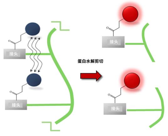 (右)蛋白酶剪切作用分離熒光團以便活化