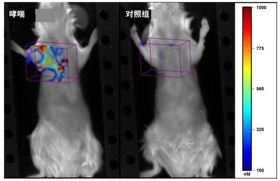 圖 3.注射 ProSense 680 的哮喘小鼠(左),肺內可見熒光和炎癥的廣泛分布。對照組小鼠(右)幾乎沒有熒光信號。