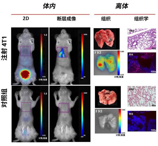 圖 4.注射 5X1054T1 細胞兩周后,注射 ProSense 750 熒光探針,使用 FMT 小動物活體熒光斷層成像系統進行活體成像,并取出臟器進行離體臟器成像。