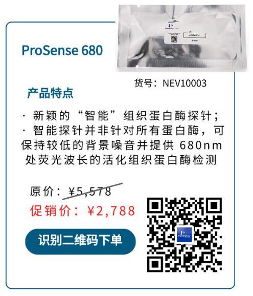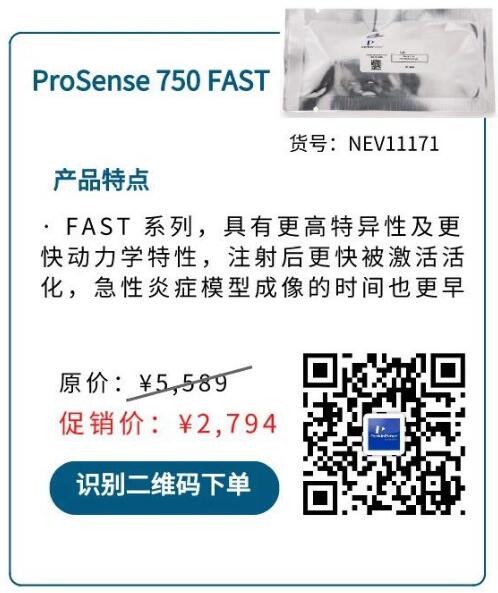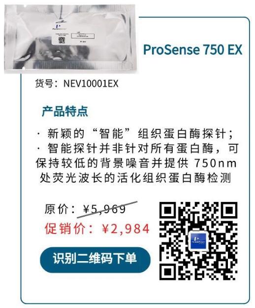 ProSense 系列熒光探針可用于檢測病灶部位高表達的組織蛋白酶(Cathepin)活性,包含組織蛋白酶B, L, S及 Plasmin,可用于癌癥,關節炎,肺炎,血管新生,蛋白粥樣硬化,心血管疾病研究及相關藥物研發。ProSense 有三種波長規格可供選擇:680、750 EX 和 750 FAST。值得一提的是,ProSense FAST (Fluorescent Activatable Sensor Technology,熒光活化傳感器技術)的藥代動力學特性更為出色,其激活用時更短,目標特異性信號更高,背景噪音更少,可顯著減少注射后的等待時間。