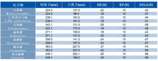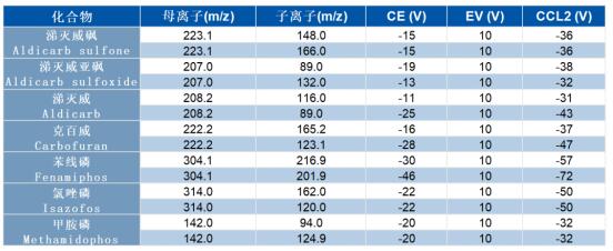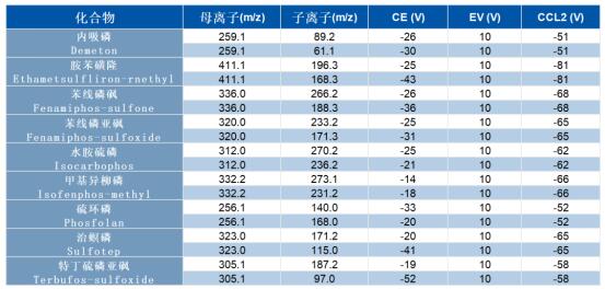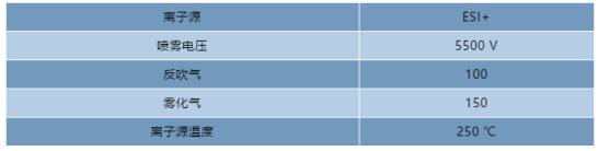 以下參數(shù)以PerkinElmer QSight 210三重四極桿質(zhì)譜儀為例,目標(biāo)化合物質(zhì)譜參數(shù)見(jiàn)表2和表3。