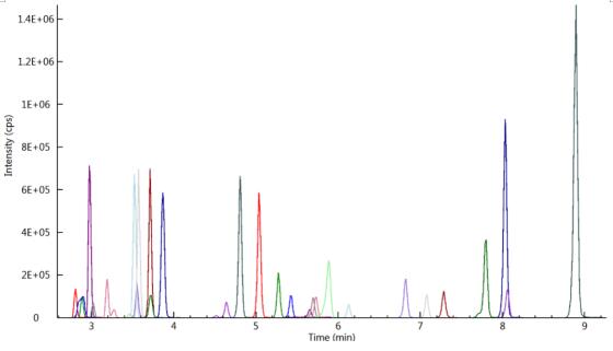 圖1. 30種農(nóng)藥化合物提取離子色譜圖(濃度為10 µg/L)