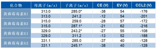 表5. 4種黃曲霉毒素化合物質(zhì)譜參數(shù)表(*為定量離子對(duì))