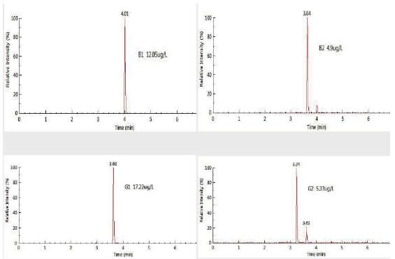 圖2. 4種黃曲霉毒素的提取離子流色譜圖