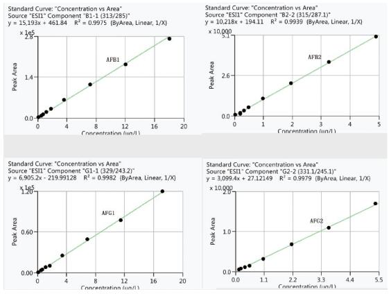 圖2中展示了采用4種黃曲霉毒素的提取離子流色譜圖,經(jīng)色譜條件優(yōu)化,各個(gè)化合物的峰型對(duì)稱,獲得優(yōu)異的色譜分離效果,圖3為4種黃曲霉毒素標(biāo)準(zhǔn)曲線,表7為相關(guān)系數(shù)和檢出下限及重復(fù)性。