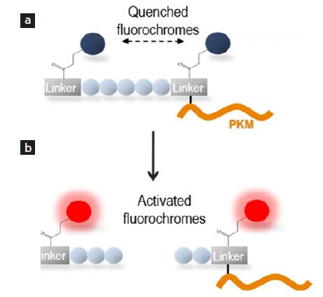 圖2. MMPSense探針激活原理圖。(a)與熒光團(tuán)非常接近的信號淬滅探針,(b)蛋白酶切割將熒光團(tuán)分開,從而能夠去淬滅并被激活。