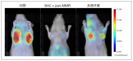 借助MMPSense熒光探針,可進(jìn)行多時(shí)間點(diǎn)化療藥物治療下的腫瘤進(jìn)展觀察。圖4顯示了未治療的對照乳腺脂肪墊腫瘤(對照),用N-乙酰半胱氨酸和MMP抑制劑(NAC + pan-MMPI)治療的動(dòng)物以及用治療劑多西環(huán)素治療的動(dòng)物。注射MMPSense 750 FAST探針后12小時(shí),通過落射熒光成像觀察腫瘤進(jìn)展。
