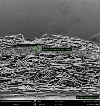 這在疫情形式嚴峻的當下,更是保證口罩質量的有效檢測手段。病毒飛沫及細小顆粒物無法用肉眼識別,而普通光學顯微鏡對于多孔類樣品的觀測能力有限,通過電鏡觀測,可了解產品基本形貌(是否有熔噴層,厚度)及對顆粒物質的吸附情況。在此,我們也歡迎廣大口罩原料生產及制造企業來納問檢測口罩質量,給予客戶更直觀安全的體驗,同時大家如果想檢測自己手中的口罩的微觀形貌,也歡迎送樣檢測,給家人和自己買個放心。