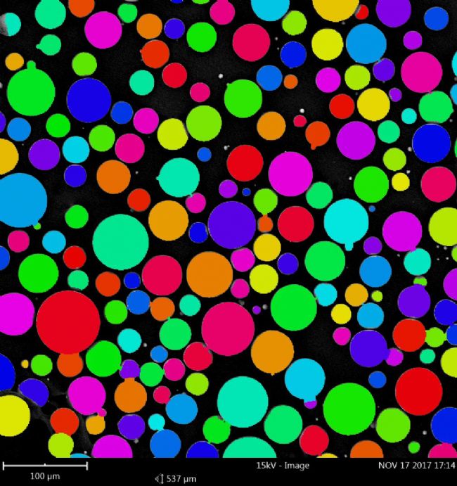 化妝品中的二氧化鈦及硅球粒徑及含量對產品的使用效果有較大的影響,利用電鏡檢測不僅可對其形貌進行實時觀察,也能對粒徑進行分析。飛納電鏡的低溫冷臺不需借助其它設備即可有效保障液體化妝品的觀察。