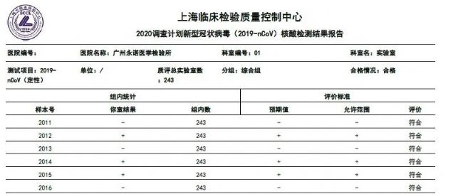 近日,廣州永諾醫檢所滿分通過由上海市臨床檢驗中心(CNAS PT0025)、上海臨床檢驗質量控制中心組織的新型冠狀病毒(2019-nCoV)核酸檢測室間質評。