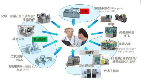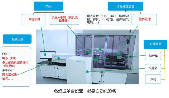 通過機械臂及中央控制軟件,將樣品及實驗器具在多臺分別用于樣品處理、檢測、存儲等的設備之間有序移動,使上述設備無縫協同工作,從而無人值守的完成特定復雜實驗流程,并實現一定通量。